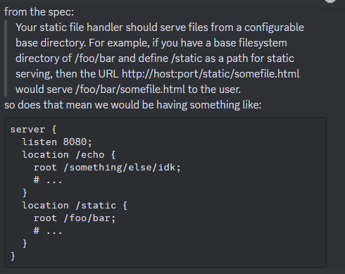 원어민인 팀원들 사이에서도 이 부분에 대해 의견이 분분했다. echo를 하고 싶으면 꼭 /echo라는 URI를 location의 뒤에 붙이라는 건지, 그리고 본문에서 echo가 아닌 정적 파일을 응답하는 예시로는 /static을 들었는데 그 아래에는 /static1, /static2 등이 등장해도 작동해야 한다는 걸 보니 그냥 echo가 아닌 모든 URI에 대해 정적파일 핸들러를 작동시키라는 건지 등에 대해 이견이 있다.